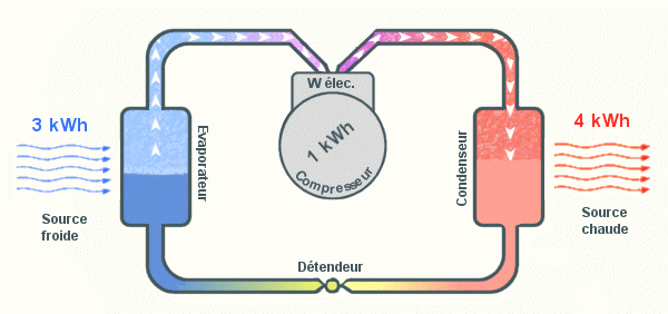Pour seulement 1kWh électrique consommé, la pompe à chaleur permet de produire de 3 à 4 kWh de chaleur pour le chauffage de l'intérieur de votre habitat en captant les calories disponibles à l'extérieur (gratuites et inépuisables).